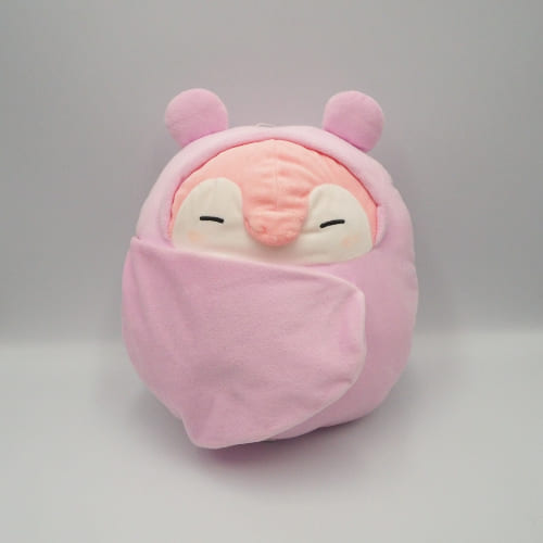 To preserve the delicate “mochi-like” texture of the fabric, you should never put your plush in a washing machine or dryer. Instead, spot-clean dirty areas with a damp cloth and mild detergent, or place the plush in a plastic bag with a bit of baking soda, shake it well, and then vacuum the powder off to remove odors and oils.